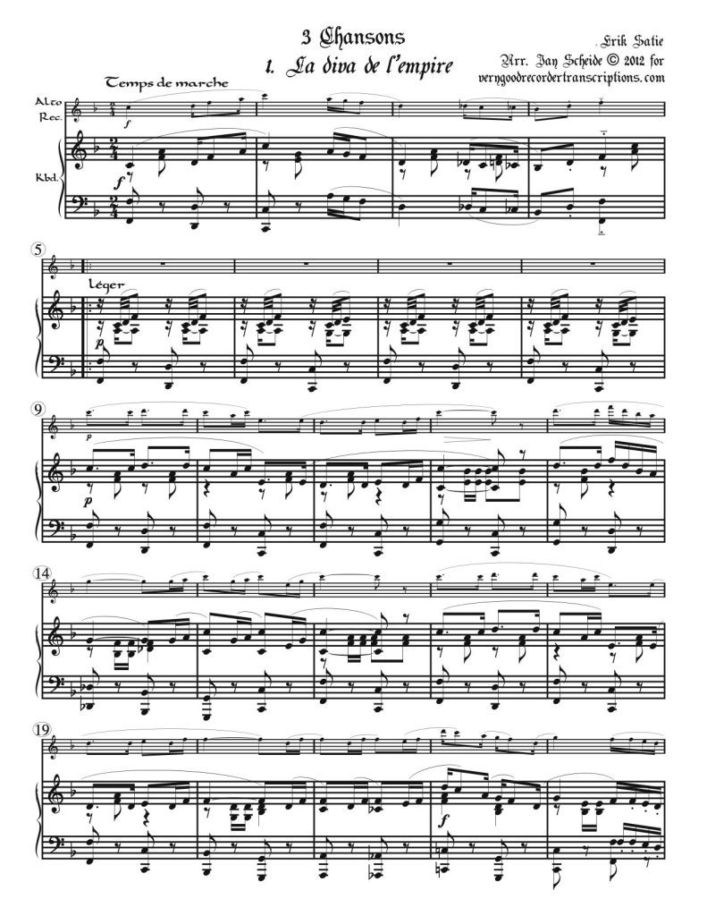 No. 1, La diva de l'empire (The diva of the empire), transposed from G major to F. No. 2, Tendrement (Tenderly) transposed from Ab major to F. No. 3, Je te veux (I want you), transposed from C major to F.
