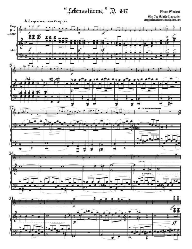 Originally for piano four-hands. Requires soprano, alto and old-pitch soprano. Note that we also offer a version of an excerpt of this piece, in a different key, in this "Recorder & Keyboard" section and alternative versions of that excerpt for alto and bass recorder in the "Duets from Dufay to de Falla" section. Revised 12.27.25.