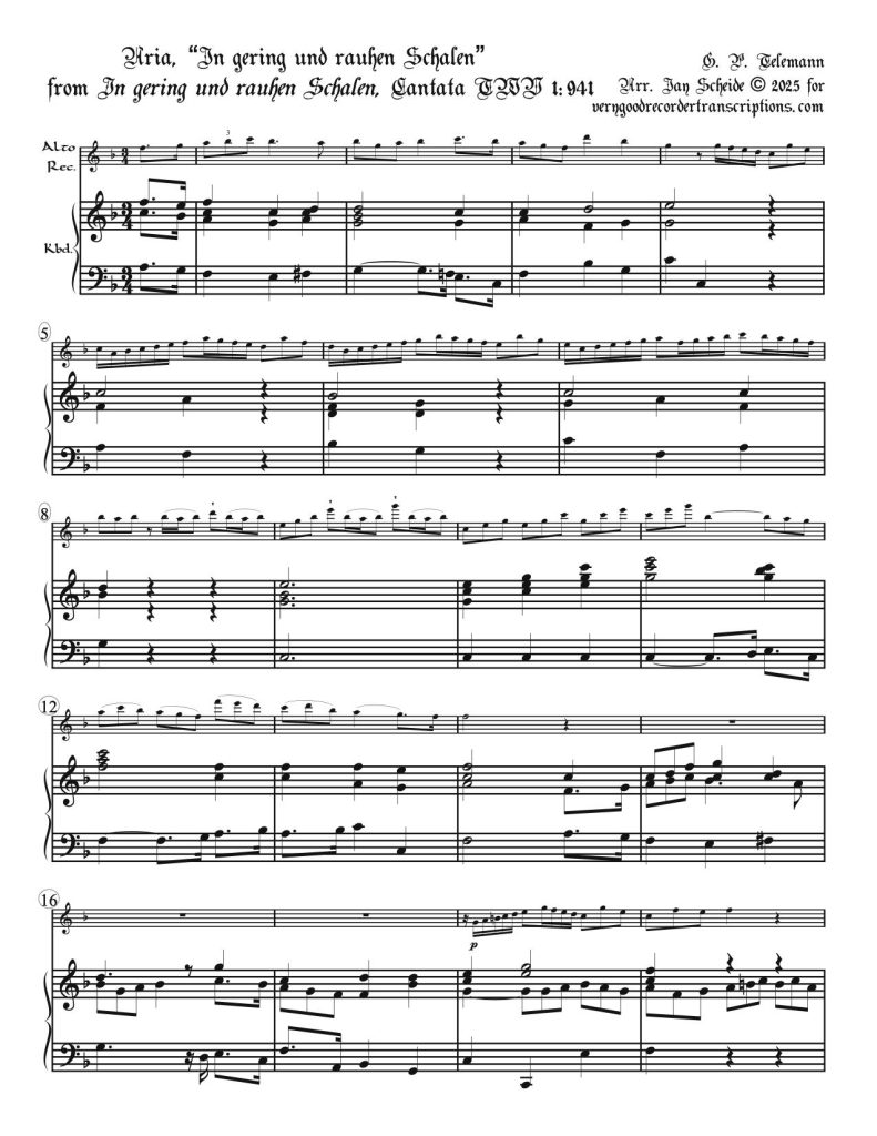 Originally for soprano voice, alto recorder & continuo. The first aria is “In gering und rauhen Schalen” and the second “Nicht uns, nein, nein, nur dir allein”. In the 1st aria it is recommended that the dotted-eighth-16th, etc., figures be assimilated to the prevailing triplet rhythm. Title & first aria mean “In small, coarse shells,” and the second aria's title, “Not us, no, no, only you alone.”